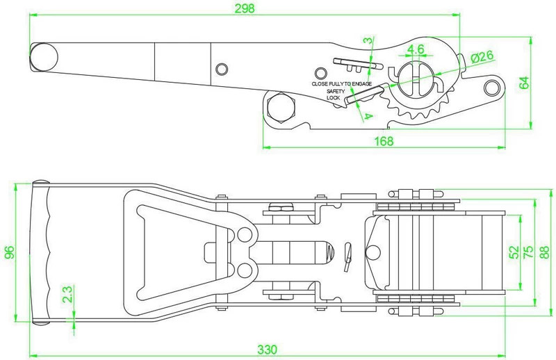 Acest clichet se montează ușor în sistemele existente de echipamente pentru camion și se folosește împreună cu chingi de 50 mm. Este recomandat pentru camioane, remorci, transport de paleți, depozite și ateliere. În timpul utilizării, verificați starea chingii și respectați limitele de încărcare.