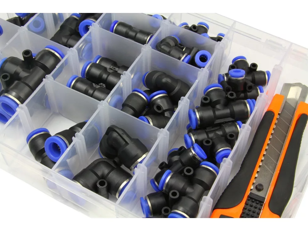Pachetul include conectori pentru tipurile PU, PV și PE, în mai multe dimensiuni, plus un cuțit pentru tăiere precisă. Montajul este simplu: tăiați furtunul drept, apoi introduceți-l în conector până la fixare. Verificați întotdeauna compatibilitatea diametrului și presiunea de lucru înainte de utilizare.